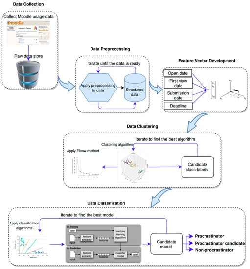 In this section, we explain our proposed approach to predict students’ procrastination behavior using their submission data. Figure 1 gives a summary of the approach and subsequent subsections elaborate each step of the approach. The proposed framework consists of five steps. First, data needs to be collected. In our case it was extracted from Moodle. Next, data preprocessing is needed to structure it appropriately for the third phase, which is feature vector development. In this step all subjects (learners in our case) will be characterized mathematically by combining information available about the objects (assignments in our case). The fourth step would be to cluster students with similar behavioral categories by means of a clustering technique and, in the final step, the data will be classified according to this and predictions will be made regarding the subjects (the procrastination behavior of students).