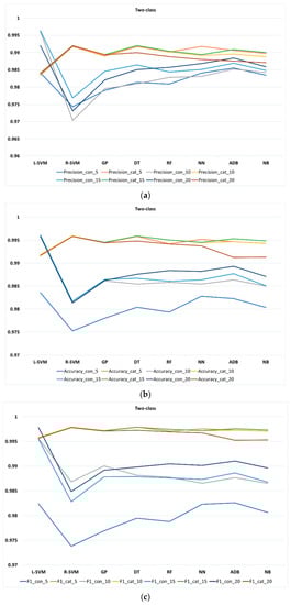 Once the best set of clusters is found by the clustering method (outputted from Algorithm 2), a predictor is trained to classify students into different classes. To do so, various classification methods are compared to find the most suitable classifier for predicting students’ procrastination behavior. These include linear and radial basis function kernel support vector machines (L-SVM and R-SVM), Gaussian processes (GP), Decision Tree (DT), Random Forest (RF), Neural Network (NN), AdaBoost (ADB), and Naive Bayes (NB). These classification methods are selected due to their popularity—the fact that they have been successfully used by many researchers in EDM research—and high performance compared to traditional methods (e.g., [,]). The classification methods with different numbers of classes are then compared by means of four different evaluation measures, namely accuracy, F1-score, precision, and recall. This process, along with the generalized algorithm of PPP, is illustrated in Algorithm 3, where 5-, 10-, 15-, and 20-fold cross-validation is used in classification, dividing the data into two parts with the purpose of statistically comparing and evaluating the learning algorithms. In other words, different k-fold (i.e., 5, 10, 15, and 20) is used to show the stability of the models. Observe that during the experiment the training and test set division will remain constant.