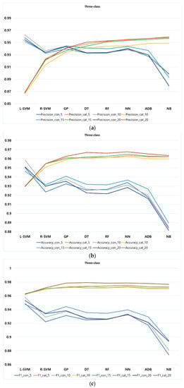 Performance metrics of classification methods in three-class at different k-folds (i.e., 5, 10, 15, and 20).