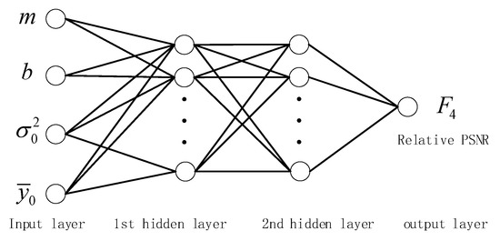 In order to accurately reveal the mapping model between relative PSNR, sampling rate , and bit-depth , we used a four-layered feedforward neural network to train the map between relative PSNR and its factors. The four-layered feedforward neural network is not necessary to reveal the mapping relationship between variables in advance, and the backpropagation algorithm is used to learn the mapping between input and output [30,31]. The feedforward neural network can minimize the loss function between the estimated value and the real value, and is widely used in regression prediction [32,33].