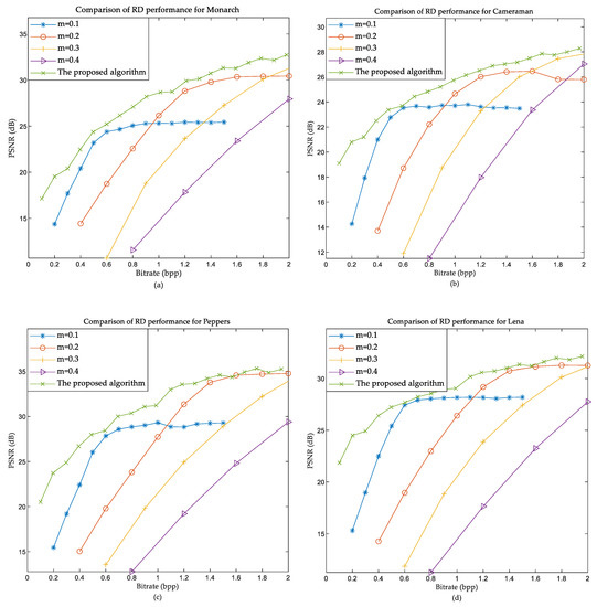 In order to verify the rate-distortion (RD) performance of the proposed method, a comparative experiment was performed with the conventional CS coding method. In the traditional method, we first used the fixed m = 0.1 and verified b to obtain different bit rates; we then obtained different RD curves by using m = 0.2, 0.3, and 0.4, respectively. Taking the images Cameraman and Lena as examples, we easily obtained the five different RD curves shown in Figure 4.