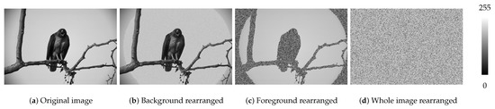 Conventional image entropy is ineffective at responding to pixel patterns over spatial. Although the image may show significantly different patterns, it must derive identical image entropy if they have the same set of pixels. (a) The eagle image is selected from BSD300, with a background of sky and the foreground of one eagle standing on a tree. Its pixels at the background, foreground, and the whole regions are rearranged respectively so that generate 3 different images, as shown in (b–d). Their entropy equals although the image contents are different.