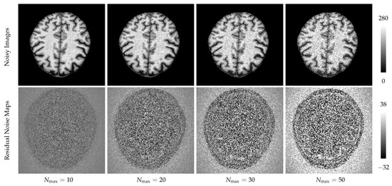 Figure 3. After added Rician noise to the ground truth data, we can see in the first row that the image is corrupted by the noise in different levels, denoted by . After subtracting the noisy image from the ground truth, we derived residual maps of Rician noise shown in the second row. Because the Rician noise is signal dependent, we can see apparent content textures in the residual noise maps.