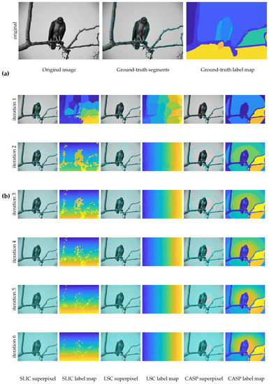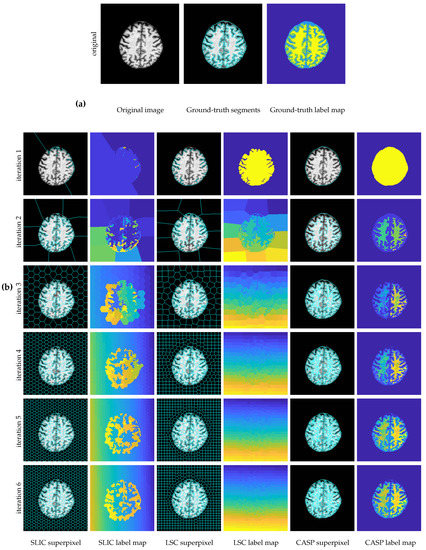 Figure 5a shows an MR brain slice from MRBrainS. The ground truth segments with 4 labels are denoted by 4 different colors in the label map. We can see from Figure 5b, in the row of iteration 1, SLIC fails to segment the intracranial region, while LSC and CASP successfully achieve this. More apparently, CASP aggregates the background as one unit and extracts more details in the intracranial regions.