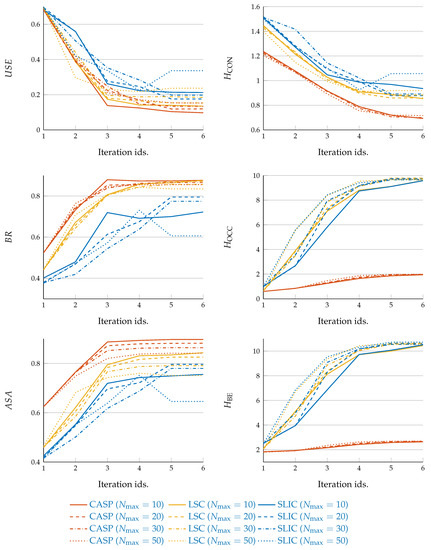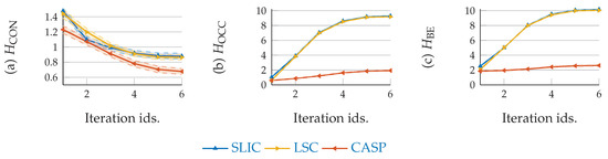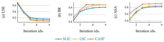 The curves and shades in Figure 8a–c demonstrate the mean and STD values across 4 subjects of , , and , respectively. The descending curve slope in Figure 8a indicates the enhancement of local coherence within superpixels. While as shown in Figure 8b, the increasing amount of superpixels drives ascending curve slope. The integral function of both terms is illustrated by , shown in Figure 8c. Most prominently, we can see CASP achieves the smallest values for all three cases. In addition, CASP increases and much less, outperforming LSC and SLIC significantly, although the total number of superpixels of the three methods are roughly identical.