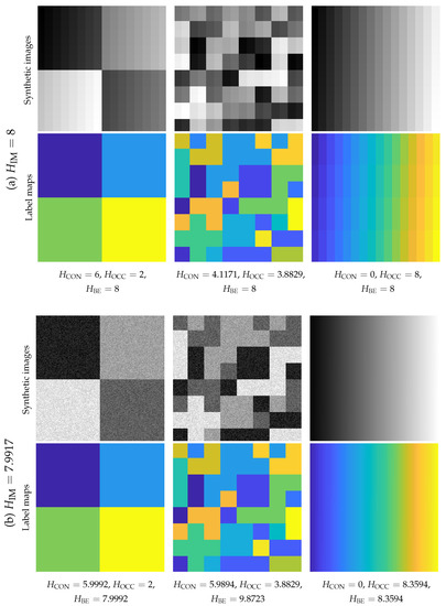In Figure 7a, each of the three synthetic images only has 256 pixels, with a size of . Every pixel is unique in intensity, which value involves the UINT8 range from 0 to 255. The synthetic images along with label maps were used to generate the , , and , attached below each label map. We can find degenerates to , which equals to 8 all the times. From the left column to the right, with the increase of superpixel number, increases, and decreases synchronously, demonstrating their complementary role. When , degenerates to . The degeneration indicates that the uncertainty contribution will only exist in the group of noticed objects if a visual system has focused on the constant objects. Typically, such uncertainty among objects may equal to the one in their exterior physical appearance.