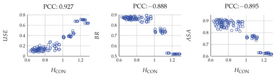 Figure 10 illustrate the correlation between and , , and respectively. Each blue circle denotes a subject (4 in total) that is represented by superpixels in a specific iteration (6 in total) and noise level (5 in total, including noise free). There are 120 samples used to generate PCC in total. No matter from the shape of scattered circles or PCC values, our results support that local image coherence and superpixel segmentation has a strong correlation.