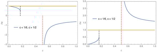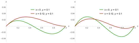 For and , Equation (16) yields . The coalescence phenomena observed with symmetrical contrarians is still valid but now it occurs at a value different from as seen from the case yielding . These two cases are exhibited in Figure 7.