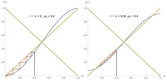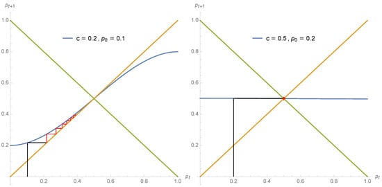Using Equation (7) the expression is shown as a function of for (left) and (right). The arrows show the dynamics from (left) for several iterations. For the second case, any initial value leads to the single attractor within one iteration. For both cases one single attractor drives the dynamics.