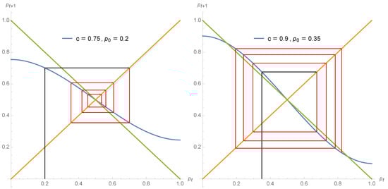 Using Equation (7) the expression is shown as a function of for (left) and (right). The arrows show the dynamics from for several iterations. Associated attractors are for the first case and for the second case.