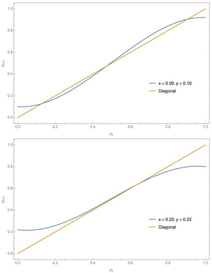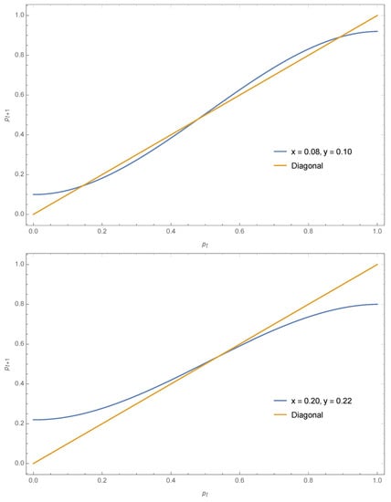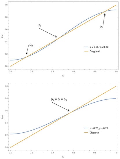 Using Equation (9) the expression as a function of is shown for (top) and (bottom). The associated fixed points are respectively and .