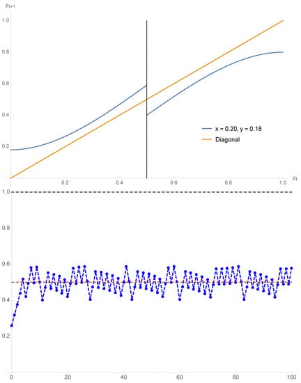 As soon as the dynamics becomes alternating. Using Equation (7) the expression is shown as a function of for (left) and (right). The arrows show the dynamics from (left) and (right) for several iterations. For the first case, any initial value leads to the single attractor but through jumps in respective supports for both opinions. For the second case, the iteration produces jumps around the tipping point but now alternating towards and .