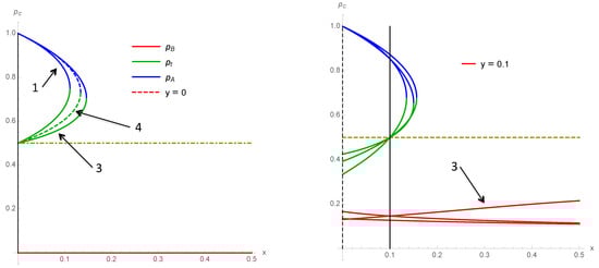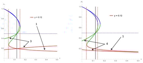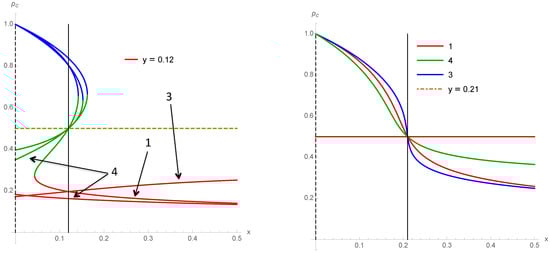 To illustrate the differences between the various schemes 1–4, we show several cases of variations of the associated fixed points as a function of x for a fixed value of y. Figure 9 compares schemes 1 and 3 and 1 and 4 for . Figure 10 compares schemes 1, 3 and 4 for and while Figure 11 does the same for and .
