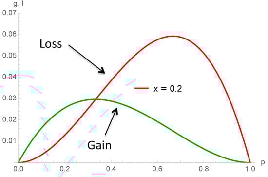 Amplitude of the negative contribution (Loss) from A contrarians (proportion x) and the amplitude of the positive contribution (gain) for . The positive contribution is seen to be bigger than the negative one for .