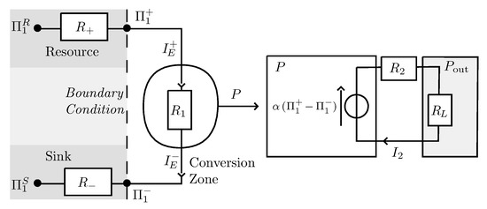 In accordance with the diagram in Figure 1, the device of the conversion zone is connected to its reservoirs via the two resistors and , which makes it possible to explore all boundary conditions. The presence of and may lead to the pinching of the potential difference according to the system operating point. More precisely, governs the limitation of access to the resource while reflects possible saturation effects of waste disposal. This global model, although limited, makes it possible to approach the behavior of many systems, including living systems, depending on whether the resource is abundant or scarce, and whether waste disposal, including thermal waste, is easy or not. Living system and non-living systems differ from the fact that the energy current is never zero in living systems, so is always finite, and there is a non-zero resting point. On the contrary, a non-living system may have a zero resting point, with zero energy current, so may be infinite in these systems. Let us consider the set of the four equations that governs the functioning of the system (see Appendix A):