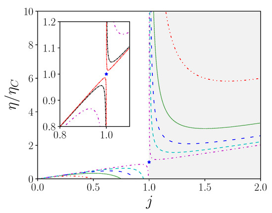 Normalized efficiency according to reduced current with (red, dot dashed), 4 (green, dots), 8 (blue, loosely dashed), 20 (cyan, dashed), (magenta, loosely dot dashed) in main figure, and (magenta, loosely dot dashed), (black, dot dashed), (red, dot dot dashed) in inset. The grey area corresponds to the receptor mode (resp. generator mode). Note that the figure is symmetrical with respect to the Carnot point (blue star), which is never reached. This singular point defines the reversible configuration, where causality is broken.