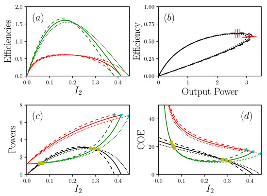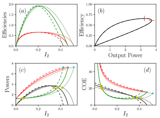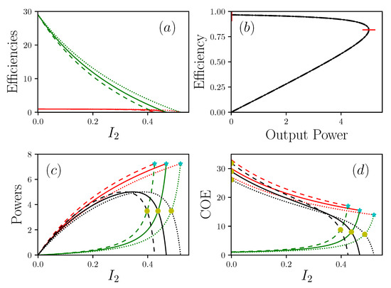 Different representations of the powers , and P, with , , , , . (a) shows efficiencies (resp. in red and green) as a function of the current of matter. (b) is the efficiency in function of the power produced P. (c) shows the power (resp. in red, green and black) , and in function of . (d) shows (resp. in red, green and black) and as a function of . Dotted lines are , solid lines are , dashed lines are . In (c) and (d), cyan stars show short circuit situations and yellow circles are critical points . In (b), vertical and horizontal red lines are respectively maximal efficiency and maximal power.