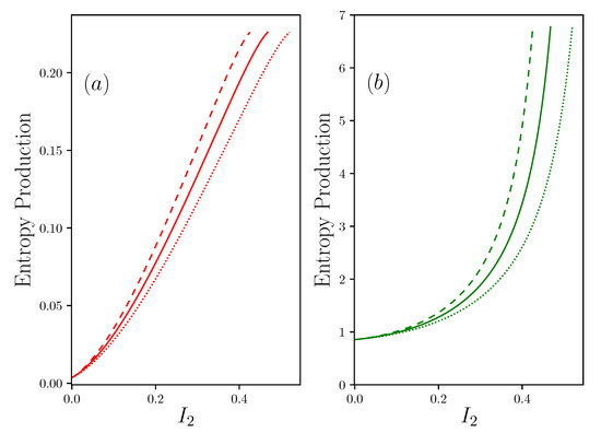 The results are given in Figure 7 where and are defined according to the Appendix B. We can see that the presence of reintroduces a significant symmetry between the two contributions to the entropy production. Moreover, the question of the importance of the quality of the coupling on the resource side, by minimizing , or to the rejection side, by minimizing , is now of equal importance.