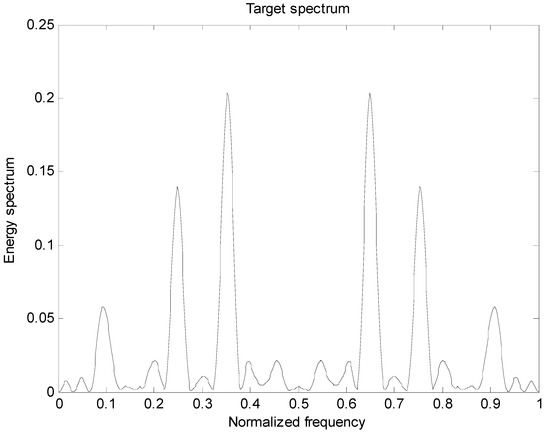 Figure 2 is the energy spectral density of the optimal transmit signal in Equation (10) based on the maximum mutual information criterion in the case of noise only. It can be seen from Equation (11) that the energy spectral density of the transmit signal is determined by the targets’ impulse responses and the clutter power spectral density . It can be seen from Figure 1 and Figure 2 that the energy spectral density (ESD) of the optimal transmit signal mainly depends on the impulse response of targets. It can be seen from Figure 3 that the optimal transmit waveform is consistent with the target impulse response waveform, and there are only some variations in the amplitude. Figure 3 shows the spectral waveform of the energy spectrum of the target transmit waveform under two energy constraints. As can be seen from the figure, under the same targets and noise conditions, the optimized waveform obtained by the optimal transmit waveform under different energy is different. It only selects the larger frequency components of the coefficients in the target spectrum, and distributes the available energy in these bands, reducing energy loss and improving energy utilization. For the case of higher energy constraint , in order to maximize the mutual information between the target population and the received echo, the resulting optimized waveform distributes its constrained energy over a large number of frequency bands instead of only a few major frequency bands.