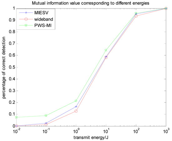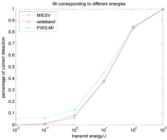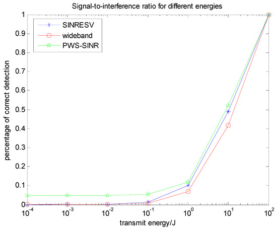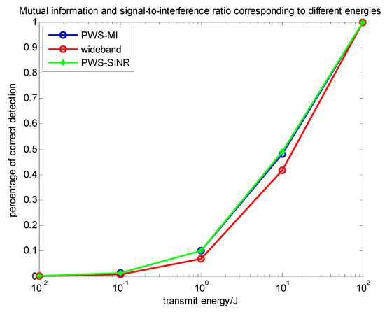 As shown in Figure 11, it verifies a comparison of the detection probabilities under the same energy constraints, the MI-maximizing waveform for signal-dependent interference outperforms the noise-only MI-maximizing waveform, the wideband impulse waveform, and the SINR-based waveform for signal-dependent interference. The wideband impulse waveform performed the poorest in extracting mutual information. It shows that in the presence of clutter, the same target and noise exist in the environment, and the constraints and energy settings are the same. In this case, we can gain higher MI and SINR in the presence of clutter. According to the theoretical derivation of the previous formulas in Equations (9) and (21), it can be concluded that the mutual information in the presence of clutter is larger than the multi-target function without considering the clutter, which is consistent with the conclusion of Goodman [5].