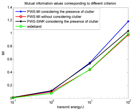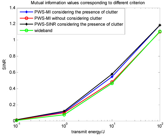In this subsection, we comprehensively analyze the algorithms and performance involved in the above two sections. Through simulation analysis, comparative analysis in Equations (7), (14) and (29) can more clearly see the relationship between the three waveforms. Figure 11 and Figure 12 compare the above several types. The relationship between the change of the situation energy and the mutual information value and the signal-to-interference ratio, they can directly reflect the information of the target and contribute to the target recognition. Figure 13 compares the data of the PWS-MI, PWS-SINR and LFM waveforms with the change of energy in the presence of clutter. The simulation results show the pros and cons of the algorithm.