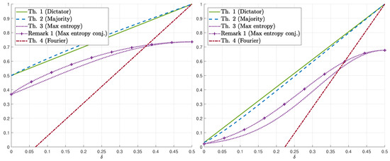 We remark that, if , the guessing ratio of functions similar to the dictator and majority functions, such as single-bit dictator on inputs ( if and only if ) or unbalanced majority ( for some t), may also be analyzed in a similar way. However, numerical computations indicate that they do not improve the bounds of Theorems 1 and 2, and thus, their analysis is omitted.