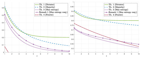 We demonstrate our results for in Figure 1 (resp. Figure 2) which display the bounds on for fixed values of s (resp. ). The numerical results show that, for the upper bounds, when , dictator dominates majority (for all values of ), whereas for , majority dominates dictator. For , there exists such that majority is better for and dictator is better for . Figure 2 demonstrates the switch from dictator to majority as s increases (depending on ). As for lower bounds, we first remark that the conjectured maximum-entropy bound (Equation (11)) is also plotted (see Remark 1). The numerical results show that the maximum-entropy bound is better for low values of whereas the Fourier-analysis bound is better for high values of . As a function of s, the maximum-entropy bound (resp. Fourier-analysis bound) is better for high (resp. low) values of s. We also mention that, in these figures, the maximizing parameter in the Fourier-based bound (Theorem 4) is and the resulting bound is as in Equation (13). However, for values of s as low as 10, the maximizing may be far from 1, and in fact, it continuously and monotonically increases from 0 to 1 as increases from 0 to . Finally, Figure 3 demonstrates the behavior of the k-dictator and maximum-entropy bounds on as a function of k.