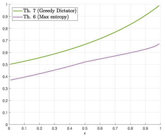 - is a non-decreasing function of which satisfies and . In addition, is attained by any sequence of functions such that is a uniform Bernoulli vector, i.e., for all .