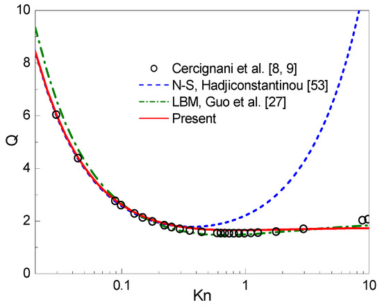 In Figure 2, the dimensionless flow rate against is plotted. The linearized BE solutions given by Cercignani et al. [8,9] using a variational approach, the NS-H solutions given by Hadjiconstantinou [53], and the MRT-LB results obtained by Guo et al. [27] are presented in the figure for comparison. As shown in the figure, in comparison with the linearized BE solutions of Cercignani et al. [8,9], the flow rate predicted by Hadjiconstantinou’s approach is accurate only for , while the present results are reasonable up to . Moreover, as reported in [2], a minimum value of the flow rate occurs at about . The linearized BE solution indicates that the Knudsen minimum phenomenon occurs at . In the present study, such a phenomenon is captured by the CLB method at ().