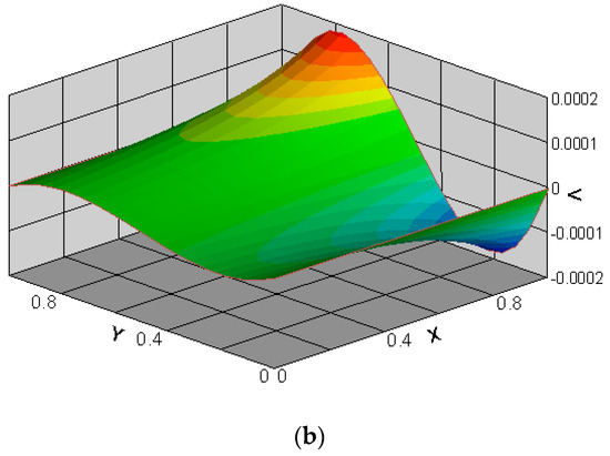 The streamwise velocity () and the spanwise velocity () for and are presented in Figure 6. The streamwise and spanwise velocities are normalized by , i.e., and . Figure 6a shows the phenomenon of velocity slip at the bottom and top walls, and along the microchannel, it is observed that the slip velocity increases. As shown in Figure 6b, the spanwise velocity’s magnitude is substantially smaller than that of the streamwise velocity, and the spanwise velocity distribution clearly indicates that as the flow progresses down the microchannel, it migrates from the centerline towards the wall. The above observations agree well with those reported in [25,31].