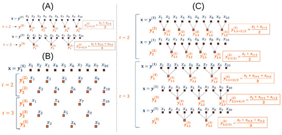 Examples of multiscale procedures for the ten first points of a time series . (A) represents the coarse-graining procedure (modified from [34]), (B) shows the time-shift procedure, and (C) illustrates the composite coarse-graining procedure (modified from [35]).