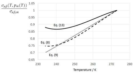 Figure 1 displays the normalized ice–water surface tension at the coexistence line, i.e., as a function of temperature T along the melting pressure curve for Equation (13) according to Jeffery and Austin [31] (Equation (8)), Equation (8) according to Schmelzer et al. [109] (Equation (30)), and Equation (9) according to Schmelzer et al. [109] (Equation (32)). Both Equations (13) and (8) exhibit the existence of a minimum, which is lost in the linearized form.