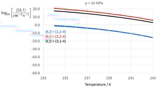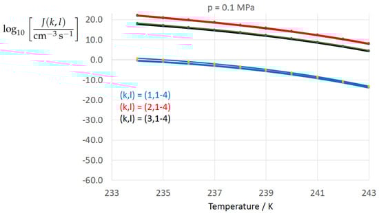 Evaluating laboratory data on homogeneous freezing within the framework of CNT, Tanaka and Kimura [52] (Equation (13)) adopted a linear dependence of the surface tension on temperature corresponding to , which is in between the comparative power values from the literature and the present analysis.