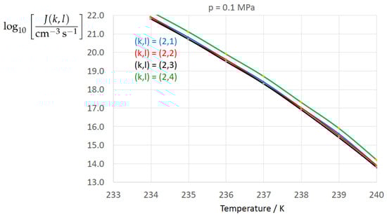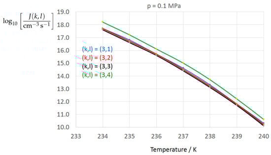 For later comparison (see Section 4.2) of the different derived expressions for the temperature and pressure dependence of the surface tension, , we take the expression proposed by Jeffery and Austin [31] (Equation (8)) as the reference surface tension, which is based on the Turnbull formula (Turnbull [124]) for , proposed for application to several metals and metalloids. By addition of a correction term, Jeffery and Austin [31] (Equation (8)) re-fitted the Turnbull expression to experimental data of homogeneous water-to-ice nucleation rates from chamber experiments at in combination with CNT application: