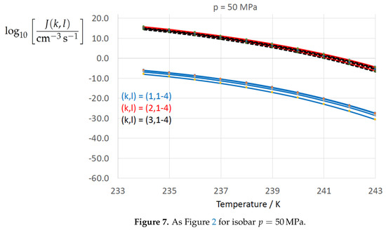 Unlike the temperature dependence of the surface tension, there are only scarce data on its pressure dependence. The simulation data of Espinosa et al. [18] (Figure 1d) revealed a positive pressure coefficient of the surface tension ( in the range ). The positive definiteness of the pressure coefficient results in a nucleation rate depression upon increasing pressure, which is used in cryopreservation of biological samples, food, and organs to avoid water freezing and cell damage by application of high pressures (Espinosa et al. [18] (Figure 1d)). The pressure coefficient of the surface tension presented in Table 10 amounts , which is in qualitative agreement with the simulation data of Espinosa et al. [18] (Figure 1d), even if their value is one order of magnitude larger. However, in view of the completely different approaches underlying the present study and those of Espinosa et al. the agreement is good. Espinosa et al. [18] emphasized that “the dependence of σ with pressure is totally unknown experimentally. In fact, there is not even a consensus for the experimental value of σ at ambient pressure (there are reported values ranging from 25 to […])”. With reference to the literature Espinosa et al. [18] speculated that originates from pressure-induced breakage of hydrogen bonds in the liquid phase. The diffusion coefficient of water increases with pressure. By hydrogen-bond breaking, the liquid is argued to decrease its structural resemblance to ice and, as the consequence, the surface tension between water and ice increases. We should add, however, that already Jeffery and Austin [31] (Figure 6), giving reference to experimental data from Huang and Bartell [30] for very small droplets (diameter ), presented graphs of the nucleation rate as a function of temperature at isobars , which also reveal a significant decrease of the nucleation rate with increasing pressure. Also the empirical parameterization of the homogeneous nucleation rate of water proposed by Koop et al. [133] predicts a nucleation-rate depression upon increasing pressure (see also Ford [54] (Figure 2)).