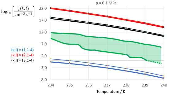 Reanalyzing the temperature dependence in Equation (13) in the form given by Equation (16), one obtains (depending on temperature and pressure), and performing the same analysis for Equation (9), one arrives at . Hence, the power n of the temperature dependence of the expressions analyzed in the present study is considerably larger than that used by Huang and Bartell [30]. Based on CNT and using MD simulations of a Lennard–Jones system to setup the nucleation scenario, Bai and Li [46] (Figure 12) derived a best-fit linear dependence of the solid–liquid surface tension on temperature, i.e., , with a positive temperature coefficient. The tendency of the temperature dependence of the surface tension was reported to be in good agreement with, among others, the nucleation data of water published by Wood and Walton [131].
