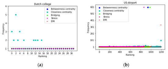 To further assess the efficiency of different measures in assigning distinct ranks to each node, we examined the node distribution in the next part of our experiment. To make the result more concise, we compared EMI with the top four measures (betweenness centrality, closeness centrality, bridging centrality, and stress centrality). Four datasets (Dutch college, US-Airport, Air traffic control, and Dolphins) were used in this part. As shown in Figure 5, EMI did a perfect job in Dutch college and Dolphins, as every node was assigned to a distinct rank. Closeness centrality did not behaved very well in these two datasets. In US-Airport, EMI and closeness centrality performed the best compared with stress centrality and betweenness centrality, which placed a lot of nodes in the same rank. In the Air traffic control network, although EMI placed dozens of nodes in the same rank, the number was far lower than those of the other four methods. As shown in Figure 5, stress centrality, betweenness centrality, and bridging centrality assigned almost 200 nodes to the same rank in the Air traffic control network. The ranking list that was obtained by closeness centrality had three ranks, into which were assigned 50, 100, and 150 nodes. Generally speaking, the ranking list that was obtained by EMI had a lower number of nodes in the different ranks, which is an urgent need when faced with networks containing millions of vertices.
