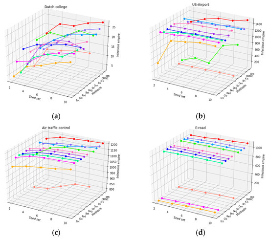 The infection epidemic with different seed sets in the six datasets, including: (a) Dutch college; (b) US-Airport; (c) Air traffic control; (d) E-road; (e) Chicago; and (f) Dolphins.