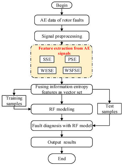 Nowadays, there are many ways to monitor fault signals of rolling bearings, such as noise signals, vibration signals, and AE (Acoustic Emission) signals. Noise signals often contain more environmental noise. It is difficult to identify the fault signals. Hence, it is often used in combination with a vibration signal in practical application. The vibration signal has become the most widely used monitoring signal due to its easy detection and intuitive signal expression. However, the inter-shaft bearing is located in engine rotor, and its vibration signal is easily affected by the connection part and the transmission part, so that the vibration signal is drowned by other noise signals. The AE signal is released outwardly in the form of a instantaneous elastic wave when the energy accumulates to a certain extent due to the unstable stress distribution inside the object when it is subjected to deformation. Common faults of rolling bearings, such as wear, deformation, and crack, will produce a large number of AE signals. As such, the AE signal is widely used in inter-shaft bearing fault diagnosis, owing to its high frequency and sensitive characteristics to impact signals [2]. Although AE signals can better avoid the interference of noise signals compared with vibration signals, the AE signal of faults is still relatively weak and contains a lot of mechanical noise due to a complicated signal transmission path. Therefore, proposing an effective signal analysis technique, improving the signal-to-noise ratio, and identifying the fault accurately, is always the hot direction of experts and scholars. In recent years, a variety of effective fault diagnosis techniques have been developed based on information fusion theory and pattern recognition methods. Hsieh et al. used the combination of empirical mode decomposition (EMD) and multi-scale information entropy to accurately identify many high-speed rotor faults, such as the imbalance, misalignment, and poor lubrication [3]. For the imbalance, cracks of motor rotors, and single, coupling faults of bearings, Romero, et al. revealed that the fuzzy logic reasoning method could be precise in classifying and identifying the information entropy of different faults, and developed an on-line monitoring system with the above theory [4]. Yu et al. proposed a motor rolling bearing fault diagnosis method based on pattern spectrum entropy and proximal support vector machine (PSVM) [5]. Ai et al. introduced the fusion information entropy distance method for the fault diagnosis of rolling bearing based on wavelet spectral entropy, singular spectral entropy, power spectral entropy, and wavelet spectral entropy of the AE and vibration signals [6]. Based on the combination of singular value decomposition and information entropy, Hernandez et al. extracted the fault features of faulty rotors and bearings to accurately identify faults [7]. Information entropy is a measure of information uncertainty. The larger the value is, the higher the system complexity is. As some faults have similar signal characteristics, information entropy can only measure their complexity and perform preliminary noise reduction and classification but cannot accurately classify. Recently, information entropy has been widely applied as the feature extraction method of fault diagnosis [8,9,10,11,12,13,14]. The purpose of fault diagnosis is to predict the discrete values at different fault states of a diagnostic object. It is a classification task; the core issue is classifier design. Random forest is a combined classification algorithm of a decision-tree based on the stochastic statistical theory and belongs to supervised learning method. This algorithm is a nonlinear modeling tool which has the advantages of fast calculation speed, high classification accuracy, and extensive generalization ability. When learning sample features are obvious, it can obtain better classification accuracy and robustness. It has been applied in many fields, such as finance and biology, and achieved good classification results [15]. Gómez-Peñate et al. presented the design of a H sliding mode and an unknown input observer for Takagi-Sugeno (TS) systems. Contrary to the common approaches of considering exact premise variables, this work deals with the problem of inexact measurements of the premise variables. The method is robust to disturbances, sensor noise, and uncertainty on the premise variables [16]. Kobayashi et al. proposed a new fault auto-detection method by which the signals measured by an accelerometer located at a far point from the diagnosed bearing can be used to detect the bearing faults automatically [17]. Santos-Ruiz et al. described a data-driven system based on PCA (Principal Component Analysis) to detect and quantify fluid leaks in an experimental pipeline and use a dynamic PCA implementation (DPCA) to capture the process dynamics [18].