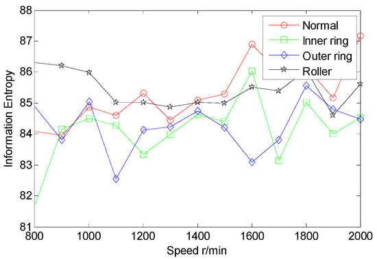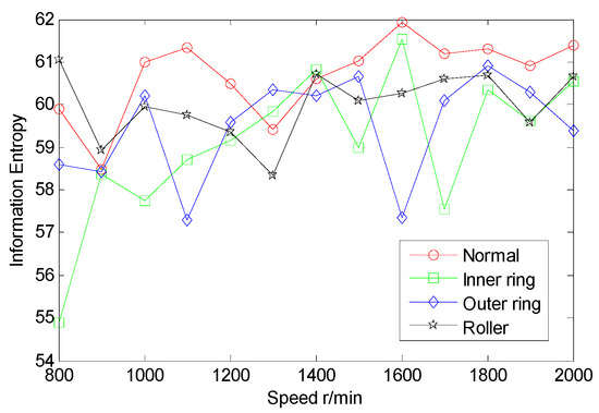 The multi-domain entropy points (MDEP) of AE signals are structured in terms of Equation (10). Each of the curves in Figure 10 is the MDEP of a fault at multiple rotational speeds. By comparing entropy point curves of the four statues, the four curves cross less, and they are basically separated. The fault data are well separable, and are suitable for fault features.