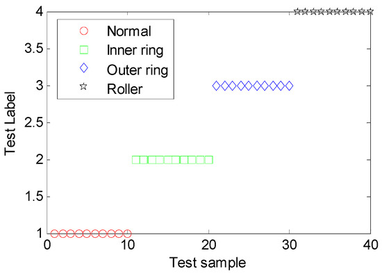 To check the modeling accuracy and generalization of the built MDERF model, we selected 10 samples for each fault from training samples to form the set of 40 samples and then tested the established MDERF fault diagnosis model. The diagnostic results are shown in Figure 11 and Table 2. As illustrated in Figure 11 and Table 2, the MDERF model completely classifies the training samples with 100% accuracy and does not have an over-fit phenomena.
