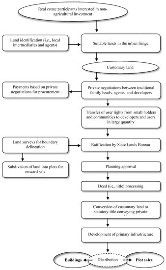 Large-scale land hoarding, throughout the developing world, stresses competition for land and results in land disputes due to escalating food prices and the necessity to cultivate more land for agriculture, “uncontrolled rural-urban immigration leading to higher population densities” [40], and increasing demand for shelter and other forms of accommodation [3,33,40,41]. According to Colin [42], numerous large land acquisitions along the urban border involve prolonged negotiation processes which revolve around hoarding of long-term rights of ownership. In Ethiopia, long leaseholds of 99 years or other agreeable titles are only decided by the State, in observance with the provisions of the Land Use Act No. 4 of 1993. The Act, as observed by Hurni, et al. [43], was promulgated following a report submitted to the Federal Government by which a land use panel examined the current system of land occupancy and advocated measures for curbing the activities of land speculators, “by making it easier for the government to acquire land” [43] for development projects nationwide, including the capital. Typical large land acquisition involves identification, negotiation, procurement, title, and distribution or subdivision. Suitable privately-owned land is first recognized through consultation with local intermediaries (i.e., traditional authorities), in which mostly local agents act as intercessors. In Shashemene’s urban fringe, some developers with the support of local go-betweens (i.e., partners) instigate direct communication with local traditional chiefs (i.e., including heads of families) when they wish to acquire land which usually instigated via a back-and-forth. It should be noted that many land deals in Ethiopia’s urban tassel are classified as “semi-formal and customary” [42] rather than formal tenure arrangements—prevalent in many African countries [44,45].