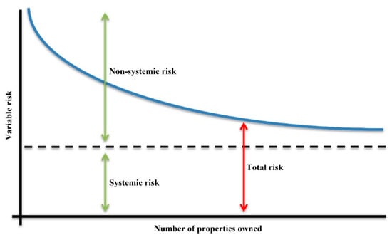 Speculators, according to Andreasson, et al. [46], are likened to “high-risk traders almost of the same kind to gamblers” [46], whereas lower risk investments grounded on core research and analysis fall into the category of desirable investments. Subject to an in-depth analysis, a good investment should “swear the safety of the capital invested in addition to ample income and yield return” [46]. On the other hand, investment processes not up to scratch with these requirements are termed as speculative in nature. In terms of systemic risk, the possibility of an event triggering severe instability or collapse of an economy, in retrospect, plays with the speculative idea of “too big to fail”. Often systemic risk can be used as a justification for government to intervene in the economy. The basis for this intervention is the belief that government can reduce or minimize the ripple effect during turbulent economic times [47,48]. As such, an important framing of variable risk in relation the number of properties owned (i.e., held) is correlative to total risk which starts off as non-systemic risk and augments to systemic risk as owned properties numbers increase (Figure 3). Sometimes, however, it has been found that non-intervention in the economy can be beneficial solely based upon the fact that if variable risk is too volatile, not doing anything (i.e., leaving the land market to sort itself) is best. This is more often the exception than the rule since it can destabilize the land market, more than projected, due to speculator sentiment [47,48,49,50].