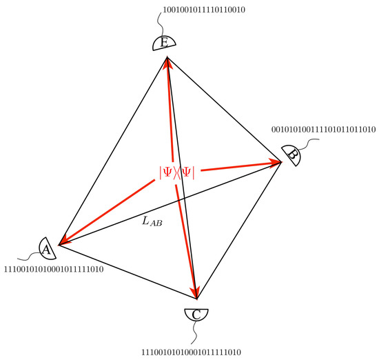 An illustration of a simplicial geometry representation of a four-qubit state illustrated by the four photons emanating from the center of the tetrahedron (arrows). The tetrahedral geometry emerges from a recording of measurements made by A, B, C, and E over an ensemble of identically prepared states. At each observer, their string of 1’s and 0’s form a binary random variable and the combination forms a joint probability distribution from which we can define the complete geometry of the tetrahedron. Here the tetrahedron is parameterized by the eight Stokes parameters of the detectors of our four observers.