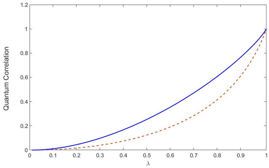 The QR (dashed line) and GQD (solid line) are plotted as a function of the entanglement parameter for the three-qubit Werner state defined by Equation (62).
