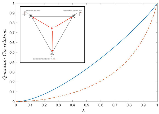 The QR is plotted as a function of the entanglement parameter for the three-qubit Werner state (solid line) defined by Equation (62), and the less correlated modified Werner state (dashed line) defined in Equation (64). The modified Werner state is formed using the state instead of the maximally entangled qutrit state.