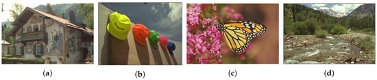First, we observe that there are no rating biases associated with the reference image contents; all of the reference images, each with different contents, are assigned the same quality score (DMOS = 0) in the public IQA database. This phenomenon is clearly reflected in Figure 3; the starting points of all curves in the same figure are consistent (because the x-axis of the figure for JPEG distortion represents the achieved bitrate, this characteristic is not reflected in this figure). Second, we find that as the level of distortion added to the image increases, images with different contents have different quality degradation curves. In other words, different image contents have different capacities for hiding distortion. For example, image (d) in Figure 2 has a dark content, and the slight distortion in it is unacceptable to the human eye. However, a further increase in the distortion level does not strongly affect an observer’s understanding of the content of “monarch”; therefore, the rate of quality degradation is slow.
