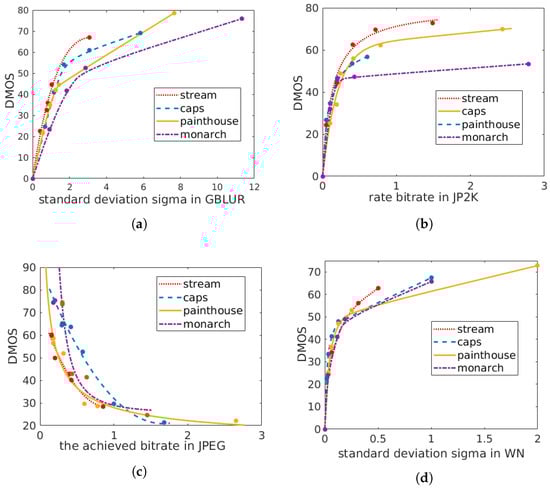 Relationship between the distortion parameter (x-axis) and the DMOS label (y-axis) for different distortion types. Each x-axis represents the distortion parameter for the corresponding distortion type. Each scatter point represents one sample in the LIVE dataset []. The scatter points representing the distorted images derived from the same reference image were separately fitted to a smooth curve. Different colors indicate different images: (a) GB; (b) JP2K; (c) JPEG; (d) WN.