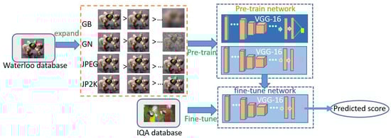 As mentioned above, our main goal is to construct a newly expanded dataset to support DNN-based BIQA tasks. We introduce saliency into the large-scale expansion strategy for the first time by creating distorted images based on the joint consideration of both saliency and distortion. Finally, we label the images based on the information entropy. The degradation of image quality in our new expanded dataset not only is related to the distortion level (as in RankIQA []) but also fully reflects the joint influence of distortion and saliency on image quality. We use this large-scale expanded dataset to pretrain a DNN and then use the original small IQA dataset to fine-tune the pretrained DNN. After fine-tuning, we obtain the final BIQA model. The flow chart of our proposed method is shown in Figure 4.
