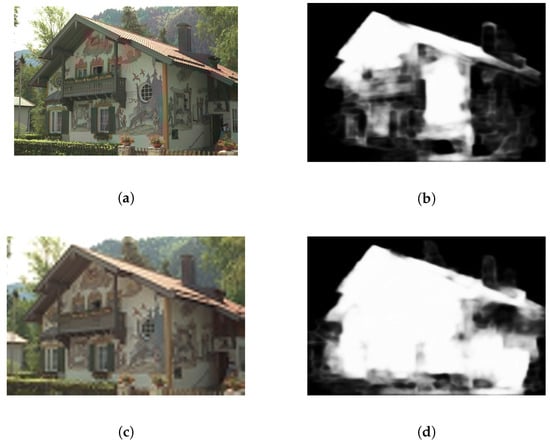 Saliency shift caused by different levels of blur. Two images with the same content but different distortion levels are shown on the left. The corresponding saliency maps are shown on the right. (a) “painthouse” with low level’s distortion; (b) the saliency map of (a); (c) “painthouse” with high level’s distortion; (d) the saliency map of (c).